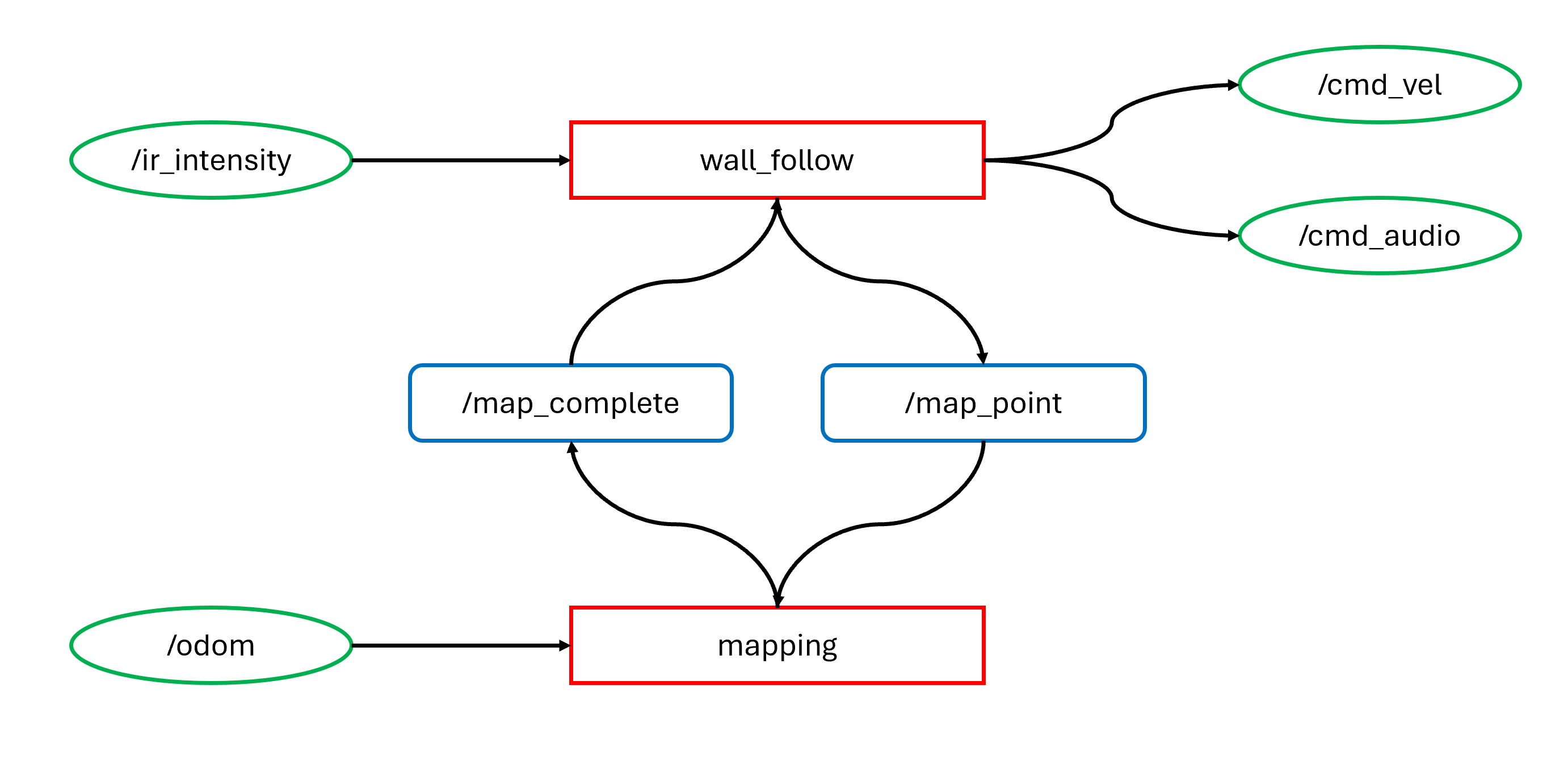 The 'wall_follow' node orchestrates the robot's movement, relying on inputs from its infrared sensors conveyed through the '/ir_intensity' topic. This data informs the robot's behavior as it dynamically adjusts its velocity via the '/cmd_vel' topic while also emitting audible cues through '/cmd_audio'. Additionally, the node interacts with the 'mapping' node through service calls, signaling milestones via '/map_point' and acknowledging completion via '/map_complete'.